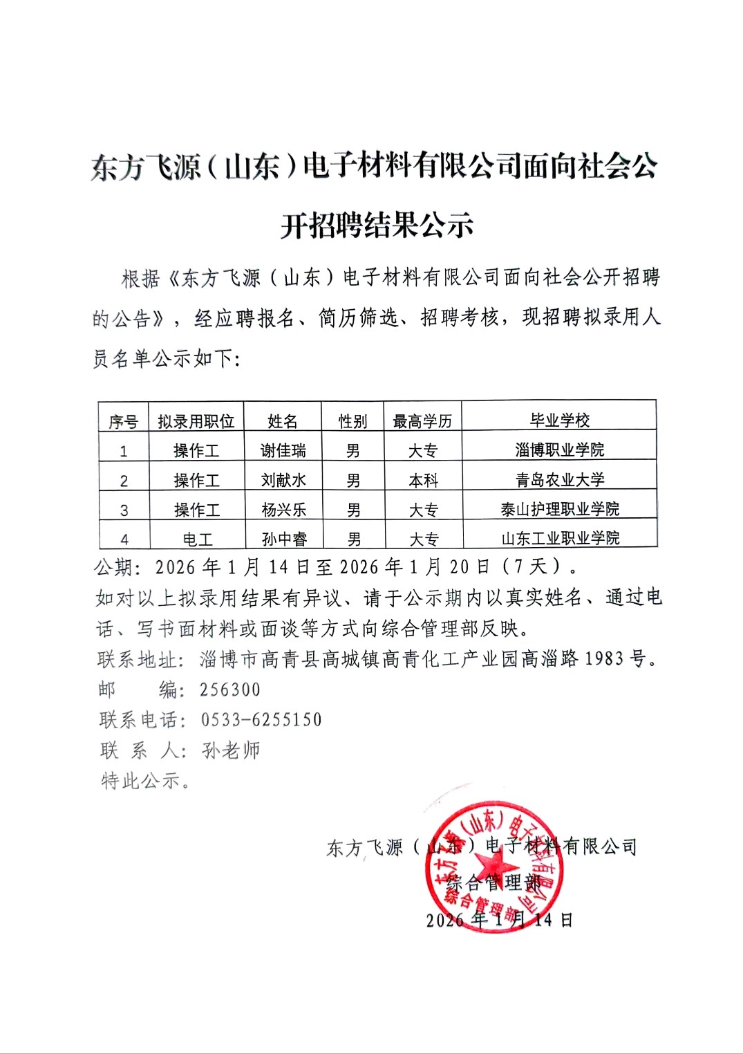 东方飞源(山东)电子材料有限公司面向社会公开招聘结果公示